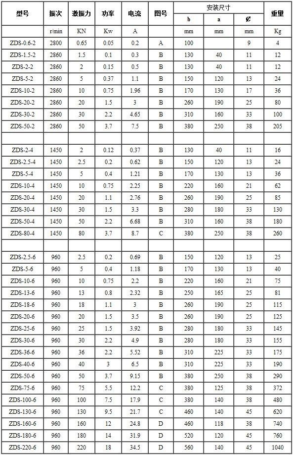 ZDS振動(dòng)電機(jī)可以在高負(fù)荷下連續(xù)運(yùn)轉(zhuǎn),使用壽命長,高品質(zhì)的制造材料,保證其可靠性。 可以承受高溫工作條件的防震電機(jī)線圈; 功率儲(chǔ)備高; 具備高承載能力的特殊軸承; 特殊油脂可持久潤滑; 高強(qiáng)度的鑄機(jī)座。ZDS系列振動(dòng)電機(jī)技術(shù)參數(shù)、外形尺寸