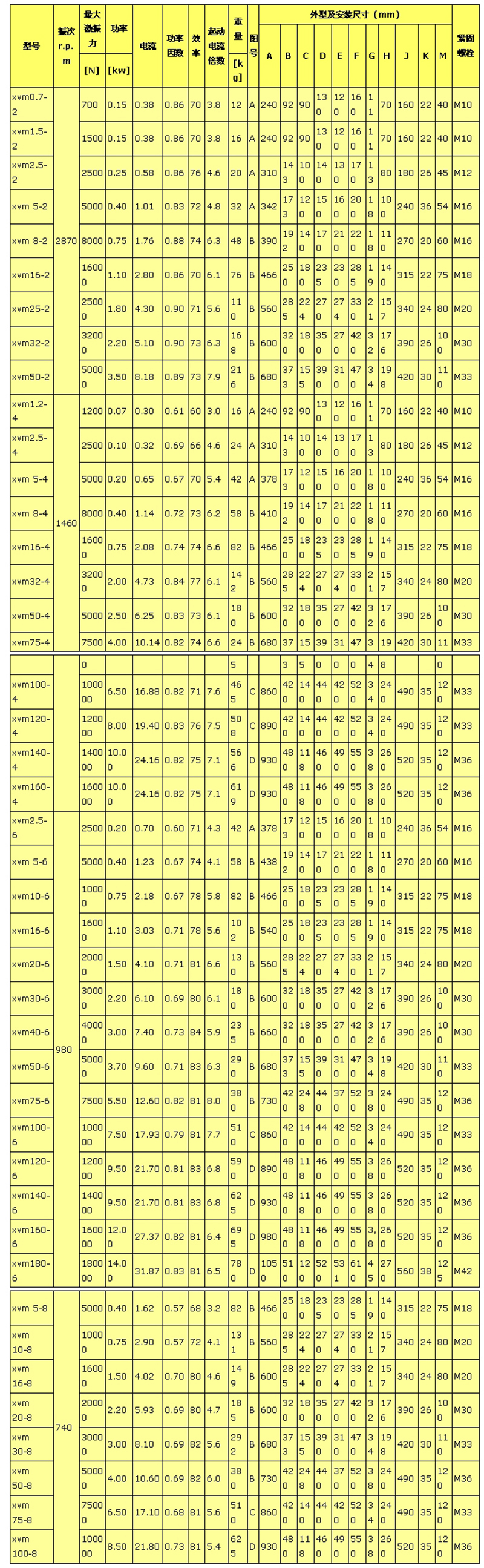 XVMA系列振動電機(jī)技術(shù)參數(shù)