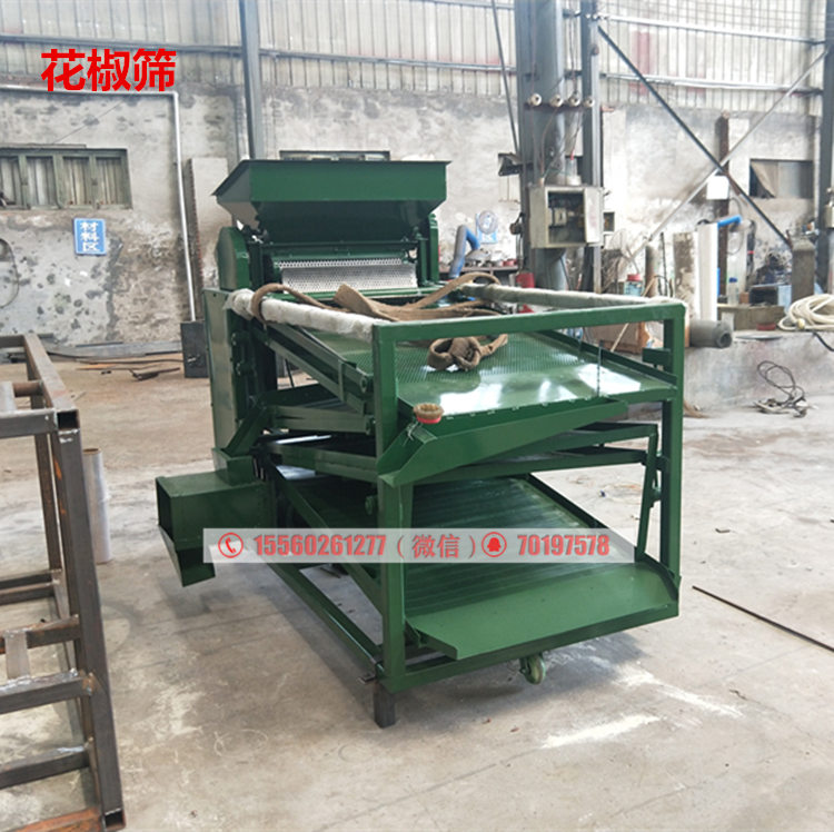 花椒清選篩專用于大紅袍花椒、九葉青、大小伏椒、狗頭椒等各種品種花椒的除雜篩選,啟動電機后,直接把物料投放進進料斗進行打碎,打碎之后的混合物料落到篩面上進行篩選,一層篩選出來的大的枝葉、梅花椒;二層篩選出來的是花椒籽,花椒籽篩出來之后進行二次風(fēng)選;三層進行復(fù)試篩選;四層是成品花椒殼,每層底篩篩選出來的小的花椒枝葉,整個運行過程只需一兩個人就能完成,操作簡單,運行穩(wěn)定,節(jié)約了人工成本,篩選凈度高,是農(nóng)戶們篩選花椒的理想設(shè)備。